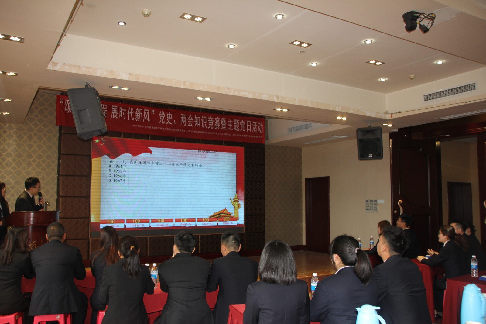 隨后,為慶祝建黨100周年,重溫中國共產黨光輝歷程,進一步激發(fā)公司黨員干部職工的愛黨、愛國、愛崗熱情,堅定共產主義理想信念,提升全體黨員干部職工的思想政治覺悟和黨性修養(yǎng),不斷增強工作、學習的責任感和使命感,營造推動公司又好又快發(fā)展的良好氛圍,促進黨史學習教育的深入開展,“頌光輝歷程 展時代新風”黨史、兩會知識競賽活動在黨支部書記朱禹同志的致辭后拉開了帷幕,本次競賽活動每隊3人,共分為供水部一隊、供水部二隊、污水部一隊、污水部二隊、行政區(qū)隊、客服部隊6個隊伍,題型有必答題、搶答題、限時題及風險題,在比賽末還穿插了觀眾互動環(huán)節(jié)。在競賽現(xiàn)場,各隊選手面對主持人的提問積極回答、沉著應對。必答題環(huán)節(jié)選手穩(wěn)扎穩(wěn)打,敏捷思考;搶答題環(huán)節(jié)現(xiàn)場氣氛緊張激烈,各隊選手拼反應,拼積累,互不相讓;風險題環(huán)節(jié)各代表隊結合當前的分數(shù),謹慎選題,凝聚知識,小心作答。經(jīng)過幾輪激烈角逐,本次活動共評選出一、二、三等獎、團體優(yōu)秀以及最佳表現(xiàn)獎。